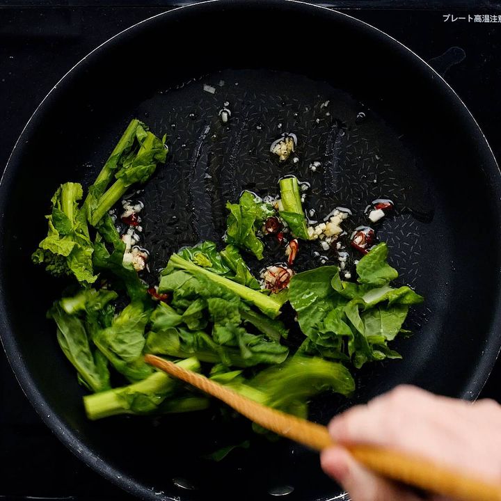 4: 菜の花の茎を加えて1分ほど炒めます。