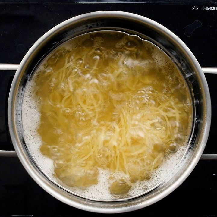 2: 鍋にたっぷりの湯を沸かして塩を入れ、スパゲッティを袋の表記時間通り茹でます。※塩の量はお湯に対して0.5%です。 この時ゆで汁は大さじ3杯ほどとっておきます。