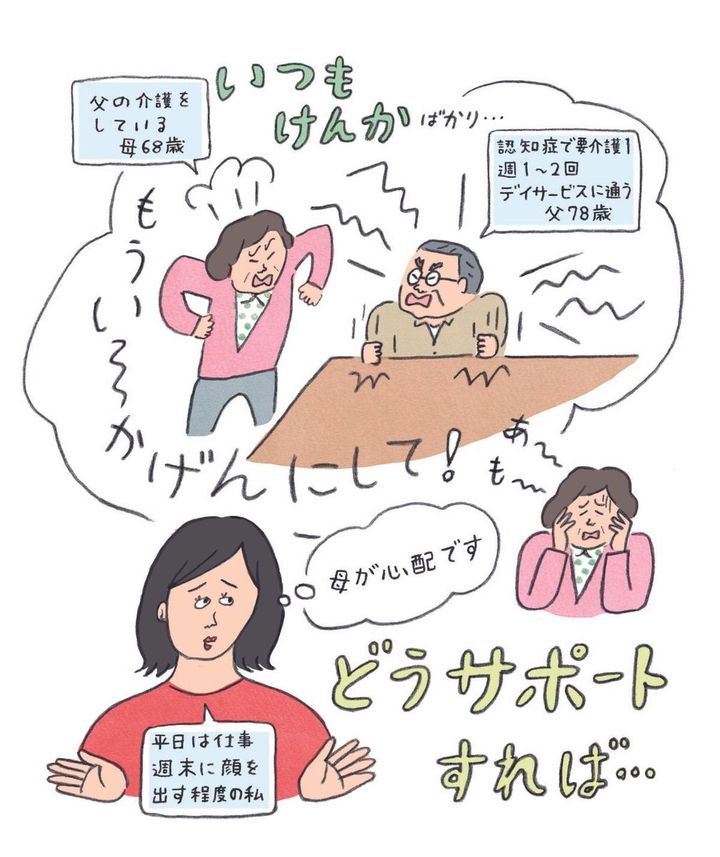 78歳になる認知症の父の介護をしているのが、68歳の母親。いわゆる「老老介護」の状態なのですが、両親の仲がよくなく、いつもけんかばかりしています。認知機能が衰えた父とは言い争いが絶えず、このままでは母の精神状態が心配です。父親は要介護1で、体はいたって元気。施設への入居はまだ考えていません。デイサービスには週に1 ~2回通っています。私は平日はフルタイムで仕事をしているため、週末に顔を出す程度なのですが、これからどのようなサポートをしていけばいいのでしょうか。