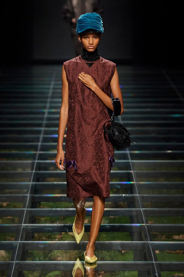 「INSTINCTIVE ROMANCE(本能的なロマンス)」と題されたプラダの2024年秋冬ウィメンズコレクションは、その名の通り、ロマンティックなリボンの装飾やディテールが随所に散りばめられていた。フリンジのようにひらめくリボンがあしらわれたファーストルックのドレスから始まり、フェイクファーが縁取られた60年代風のシフトドレスにリボンの装飾、ボトムの背後にリボンモチーフが掲げられ、スカートのウエストからもストラップリボンが覗く。多種多様なリボンの表現がエキセントリックに輝く。さらに会場のゲストの目を釘付けにしたのはバッグに幅広のベルトストラップをつけ、まるでチャームのように持ち歩く、新しい持ち方の提案。プラダらしい、気品とクラシカルなムードは大切にしながらも、センタープレスのパンツをアレンジしたようなスカートや前身ごろと後身ごろでイメージの異なる切り替えデザインなど、異なる要素の融合や多面性をふんだんに交差させた。
