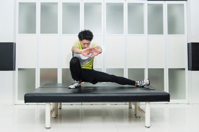 (1)床にしゃがんで、その姿勢から片方の脚を横に伸ばす
