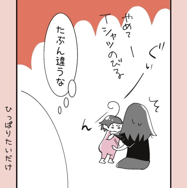 シャツひっぱるのあるあるです~!のびたり戻ったりするのが楽しいのかな?