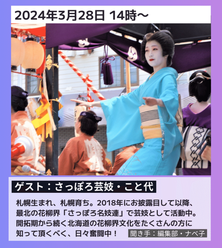 今月のゲストは、札幌の芸妓・こと代さん!芸妓ってどんな仕事?普段はどんな生活をしているの?芸妓には、どこに行けば会えるの?などなど、芸妓さんの裏話をアレコレお聞きします!