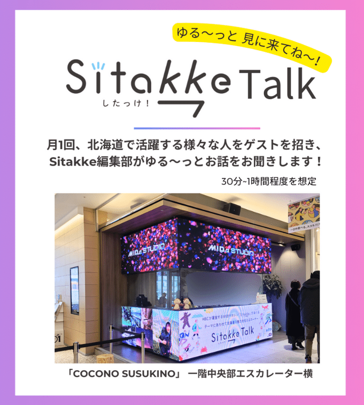 SitakkeTalkでは、月1回、北海道で活躍する様々な人をゲストを招き、Sitakke編集部とゆる~っと対談をしています。
