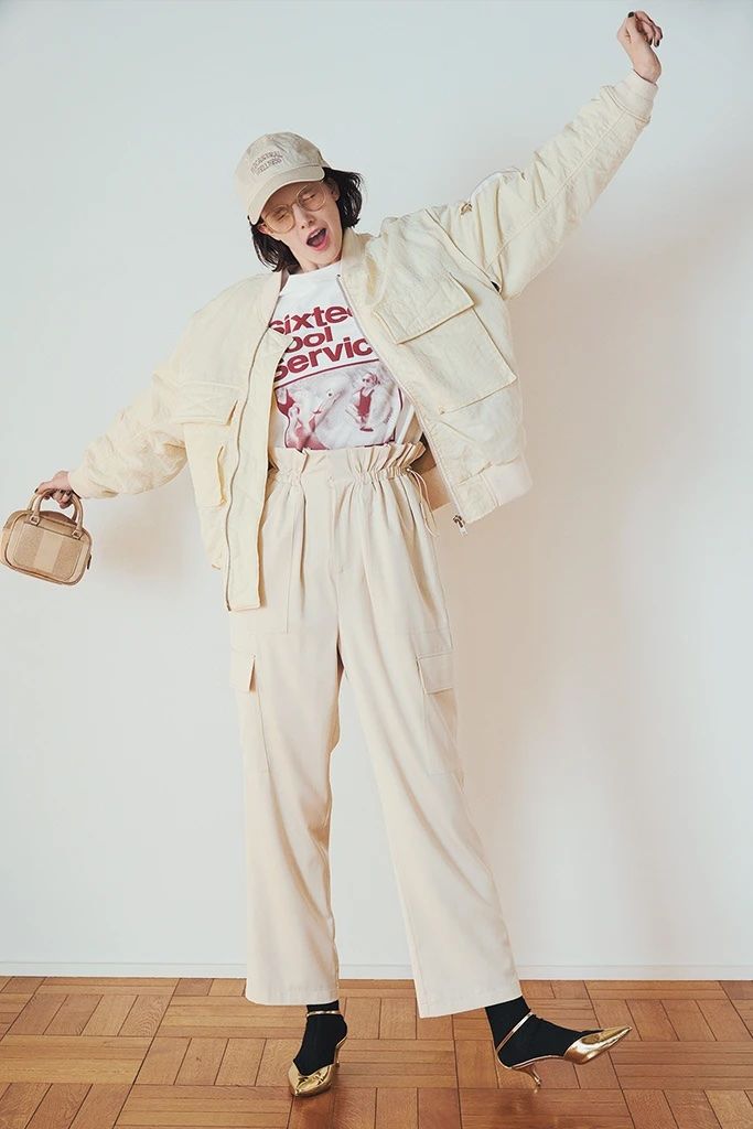 白カーゴパンツは着まわし。ブルゾン 23,980円/SeaRoomlynn ロゴT 7,997円/THROW by SLY(バロックジャパンリミテッド) キャップ 4,950円/マイカ アンド ディール(MICA & DEAL 恵比寿店) 眼鏡 61,710円/オリバーピープルズ(ルックスオティカジャパン カスタマーサービス) ソックス 3,520円/パンセレラ(真下商事) シューズ 59,400円/ネブローニ(アルアバイル)