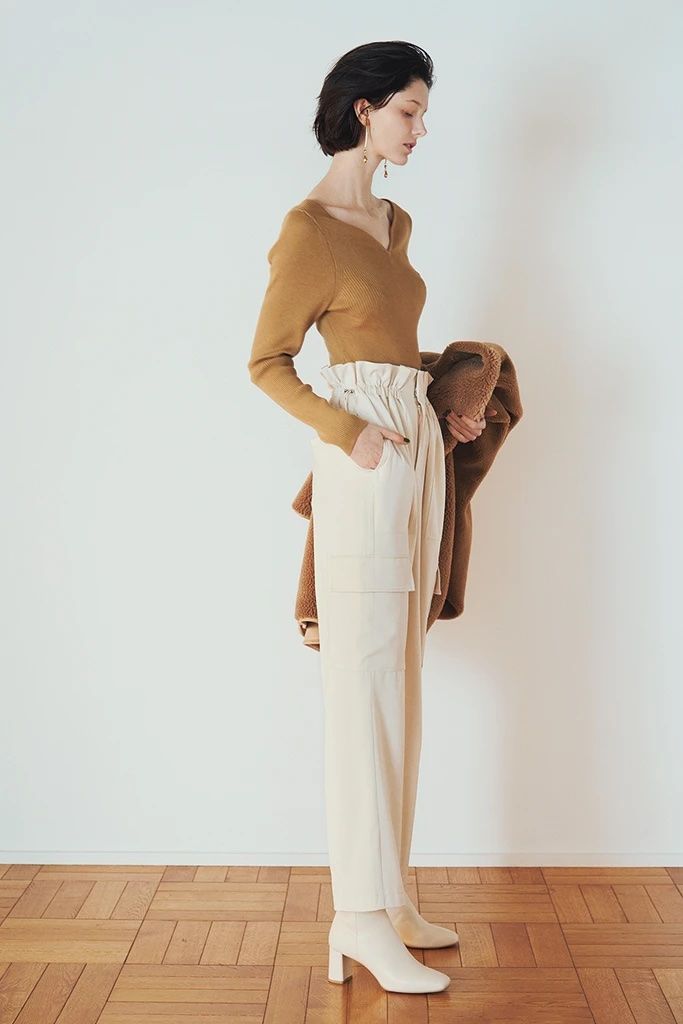 ゆるい服でスマートなシルエットを形成。トップスはニットながら重たさを感じさせないピタッとしたVネックのリブ素材。パンツとブーツを白でつなげて、軽やかな色を多めに配分。さらに脚長に見せる効果も。