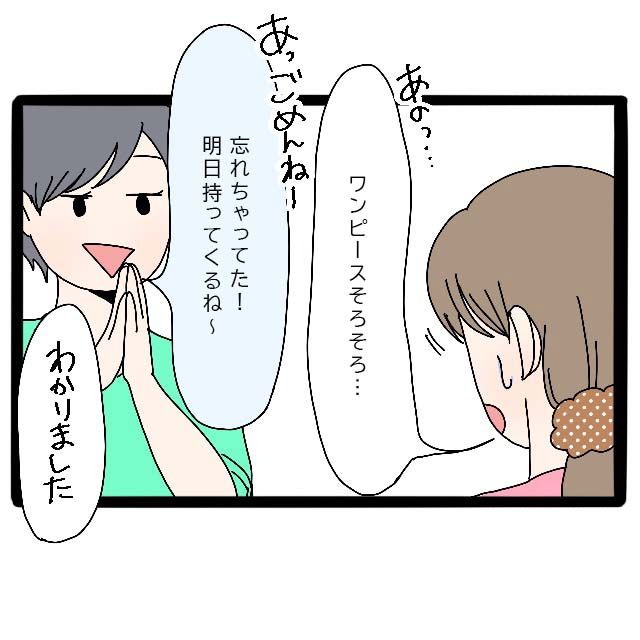 あまり強く言えないさやママは「ワンピースそろそろ・・」と勇気を出してユミママに言うと、「ごめんねー明日持ってくるね~」とあっけらかんとしたご様子。