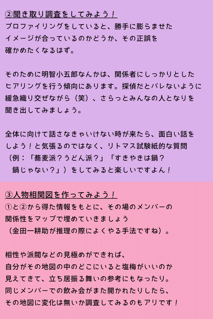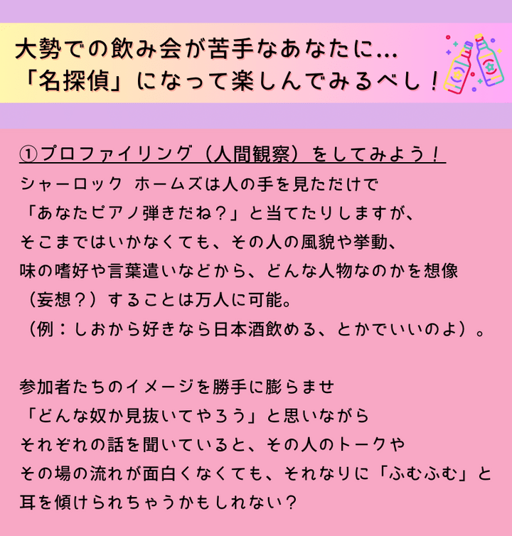 もっと具体的に、役柄を指定した上で言うと、次に大人数の飲み会があったら、その場に「名探偵」になったつもりで潜入してみてほしいの。