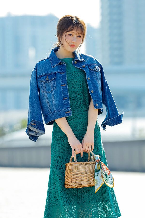 華やかさも上品さも抜群なレース素材のワンピは、レディたちの必需品。おしゃれを一歩リードしたいならフレッシュなグリーンカラーが今季は推し。Gジャンの肩掛けで着崩せば、休日仕様の今っぽリラックスコーデが完成。