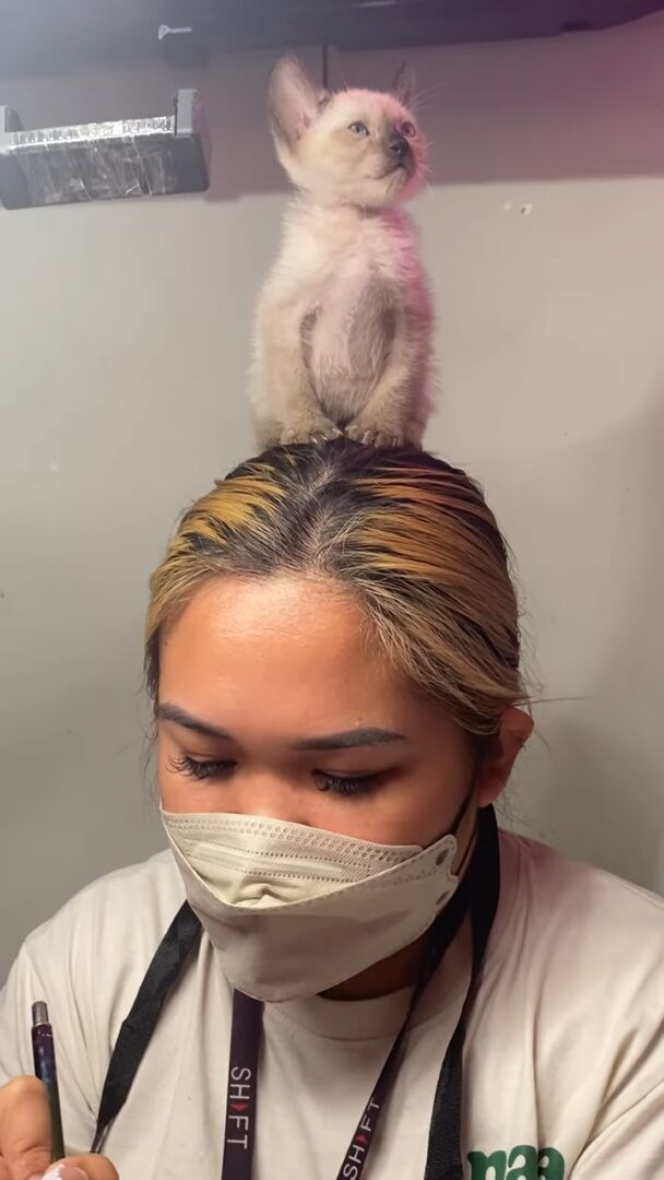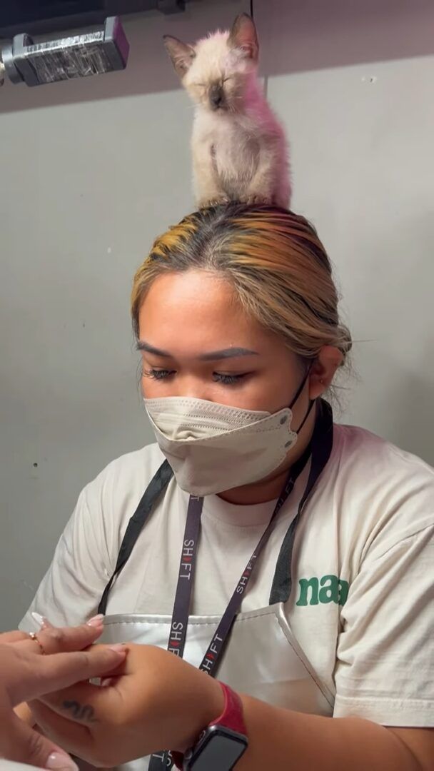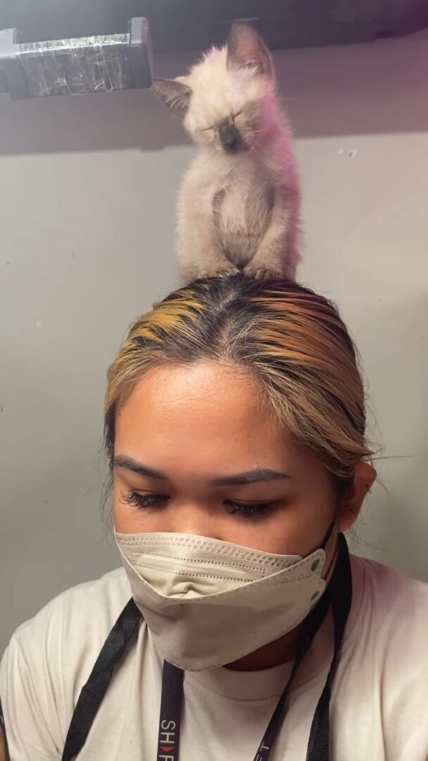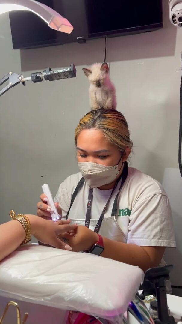 爪の施術をしているネイリストの女性。 その頭の上には、居眠りしている子猫の姿がありました。