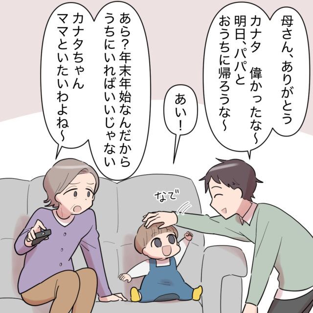 カナタくんを預けている義実家の様子が心配で見に帰ったゆうさん。翌日に帰る事を告げると義母はつまらなさそうです。