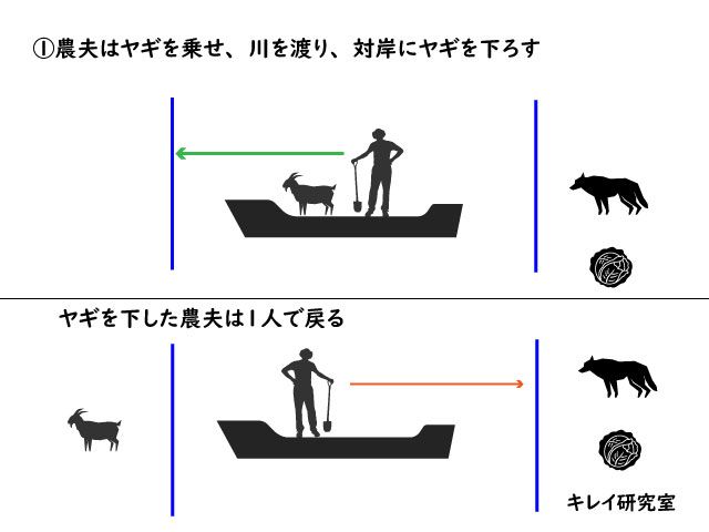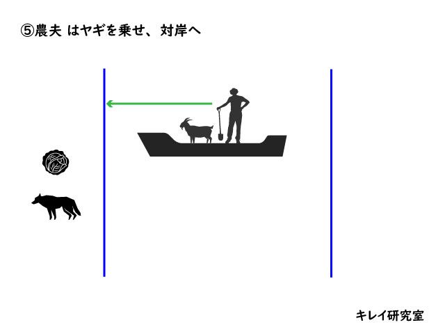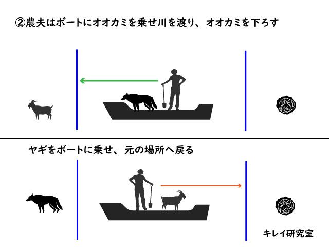 2)農夫はボートにオオカミを乗せ川を渡り、オオカミを下ろし、ヤギをボートに乗せ、元の場所へ戻る