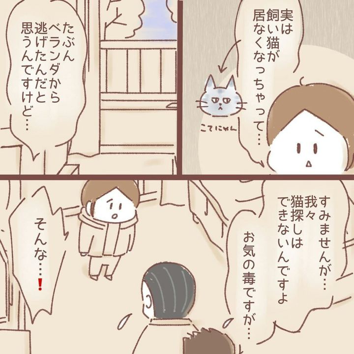 室内を調べ終わった警察官に、紅ほっぺさんは飼い猫が居なくなったことを伝えましたが、警察の仕事外だと断られてしまいます。この後、こてにゃんは無事に見つかるのでしょうか?