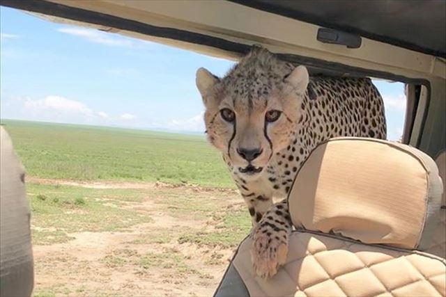 【緊迫の10分間】車内に突然入り込む野生のチーターを撮影した動画に息をのむ