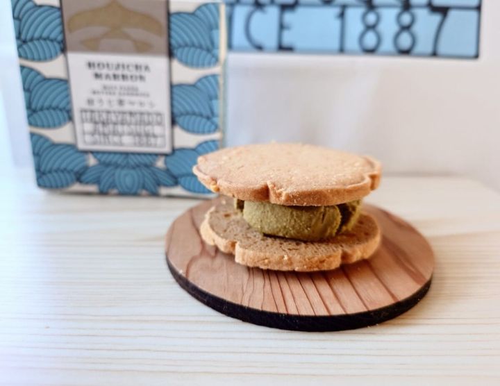 ほうじ茶と甘露煮の栗を刻んだバタークリームをサンドした「ほうじ茶マロン」。濃厚なバターにほうじ茶の香りが豊かに広がって、後半には栗の風味も心地よい。ほうじ茶好きに捧げたいリッチな和フレーバーです。