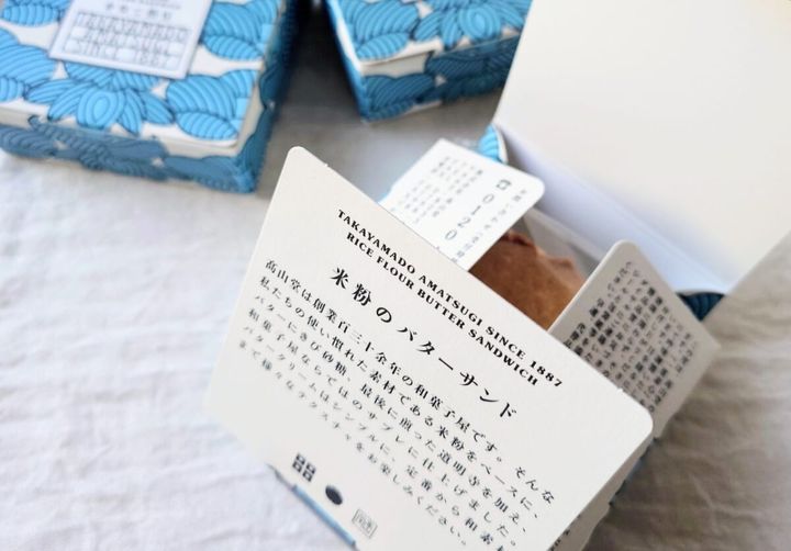 「TAKAYAMADO AMATSUGI」の「米粉のバターサンド」が洋菓子のものと大きく違うのは、「卵・小麦粉は不使用」で、その名の通り「米粉・玄米粉・道明寺粉」など和素材をメインに使っているところです。