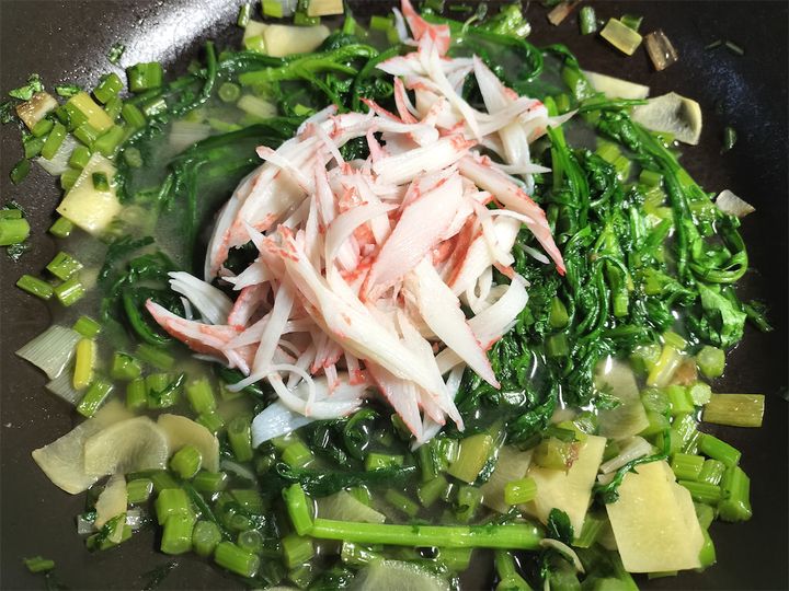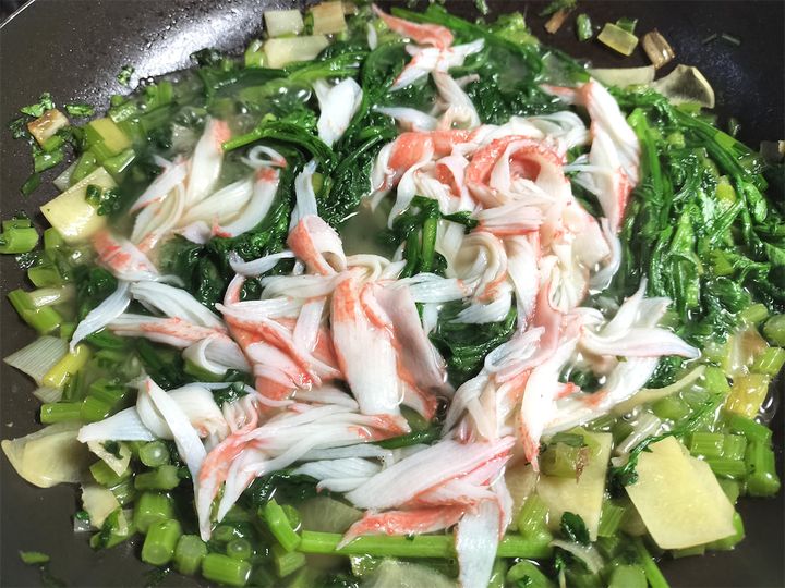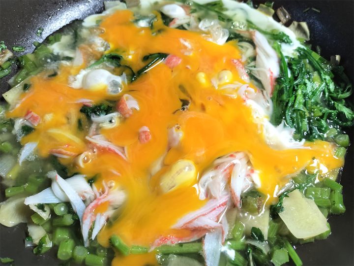 6.ほぐしたカニカマを入れ、続けて水溶き片栗粉を加えてとろみをつけます。