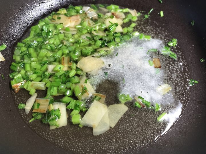 1.フライパンにゴマ油を引き、長ねぎとしょうがを中火で香りが出るまで炒めます。