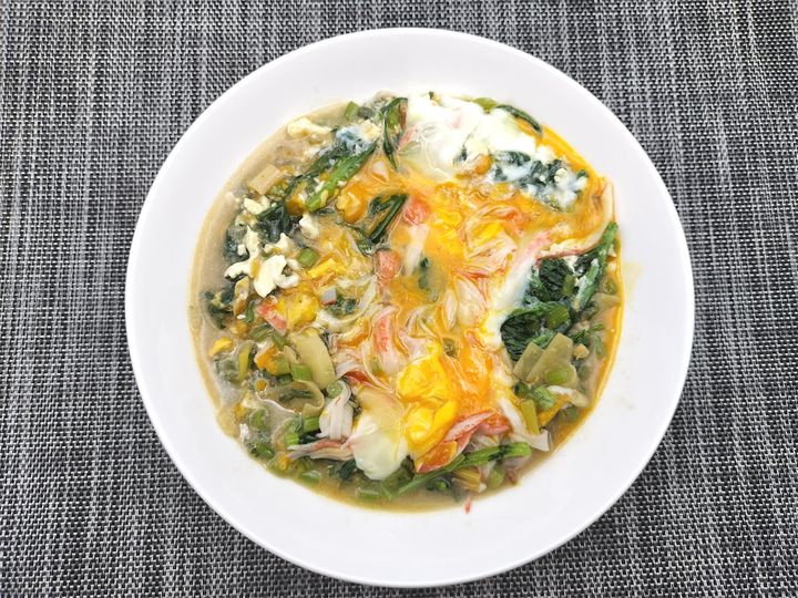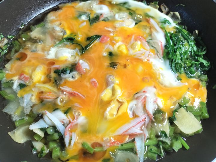 春菊が多いかなと思いましたが、火を入れるとしんなりして丁度いい量になりました。春菊は長いままでもおいしいのですが、スプーンなどで食べるのであれば短く切ってもよいと思います。芙蓉蟹に春菊を入れたことがなく、そもそも中華に春菊を使う発想がなかったのですが…。実際は特有の苦みがとても合い、ご飯はもちろんのこと酒の肴にも合う味です。香りも味も超がつくくらいに本格中華で、カニカマで作ったとは思えないほどおいしい芙蓉蟹です。