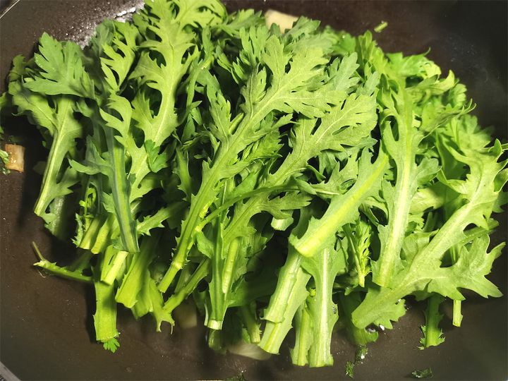 4.煮立ってきたら春菊の葉を加えます。