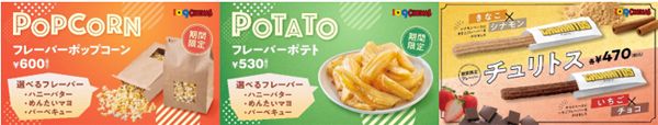飲食売店にも新メニューが登場しています。ポップコーンやポテトは、ハニーバター・めんたいマヨ・バーベキューの3種類のフレーバーがスタンバイ。また、既に販売していたチュリトスのシナモン味、チョコ味に新フレーバーが加わり、「きなこ×シナモン味」と「いちご×チョコ味」が新登場。今回、他エリアの109シネマズで販売したところ好評の声が多かったので、同館でも販売が決定したそう。どれも気になるフレーバーで迷いそうです。