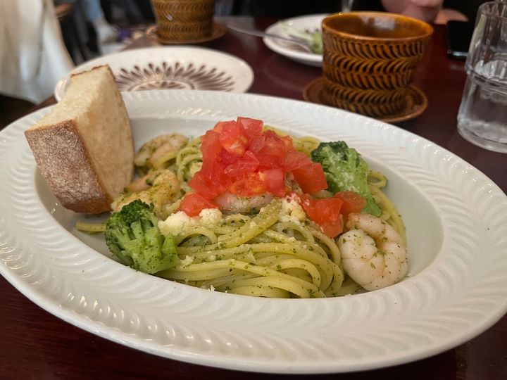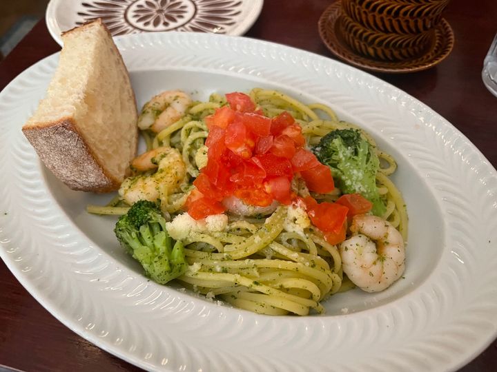 バジルのジェノベーゼソースにチーズがかかっていて、具材はトマトと海老とブロッコリー。 シンプルですが風味が良いです。 パンにつけるようなパスタソースではなかったですが、パンもぺろり。