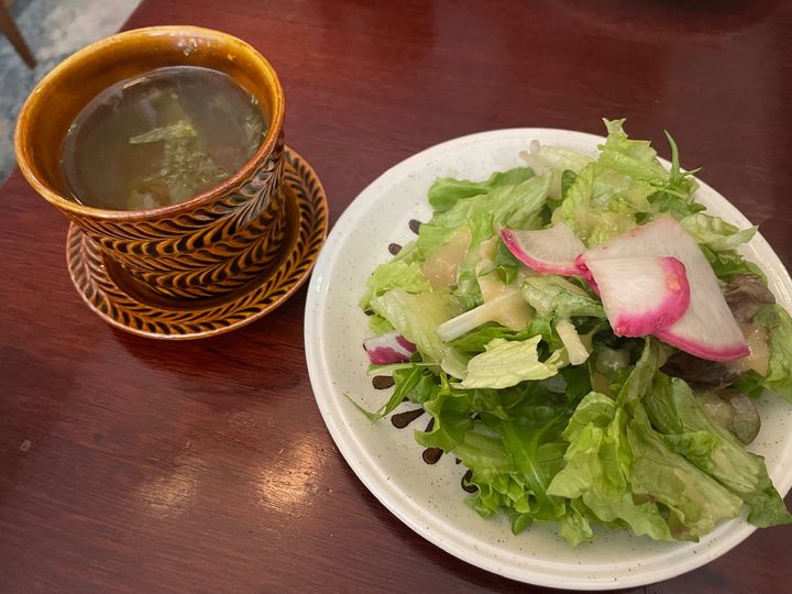 セットなのではじめにスープとサラダが提供されます。 スープも玉ねぎたっぷりで、さらさらだけど味が濃くて美味しい。 このお店、一つひとつが全部美味しいんですよね。