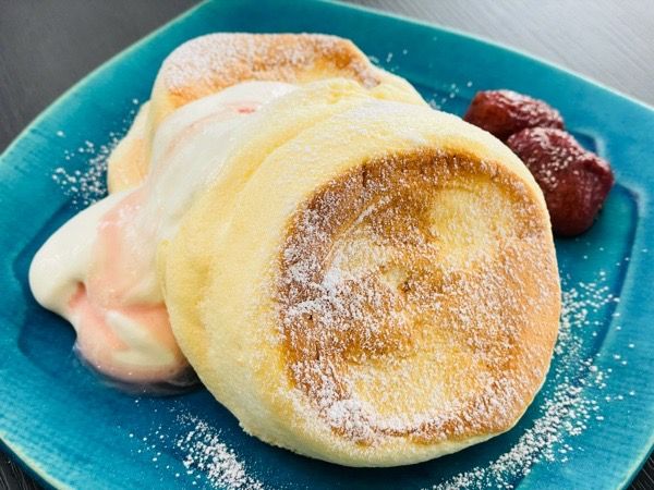 ふわふわのパンケーキも是非食べていただきたい。2枚セットで、トッピングが色々選べます。今回は生クリーム・イチゴソースにしました。
