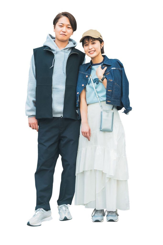 七海さん:Gジャン¥17,600 Tシャツ¥5,170(ともにラングラー/エドウイン・カスタマーサービス)スカート¥22,000(MilaOwen)バッグ¥15,400(ヴィオラドーロ/ピーチ)スニーカー¥11,990(ニューバランス/ニューバランス ジャパンお客様相談室)キャップ¥4,840(ニューエラ)ピアス¥4,830(アビステ)時計¥24,970(クルース/HIROB ルミネ新宿店)