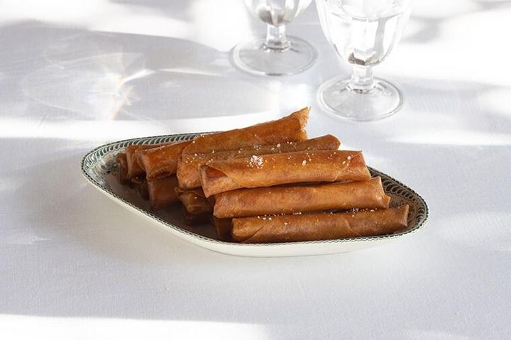 春巻きの皮を三角形の底辺を手前に置き、手前に②を1本のせ、胡麻ひとつまみと松の実3〜4粒をのせる。なるべく隙間がないように包み、小麦粉を水で溶いたもの(分量外)で留める。