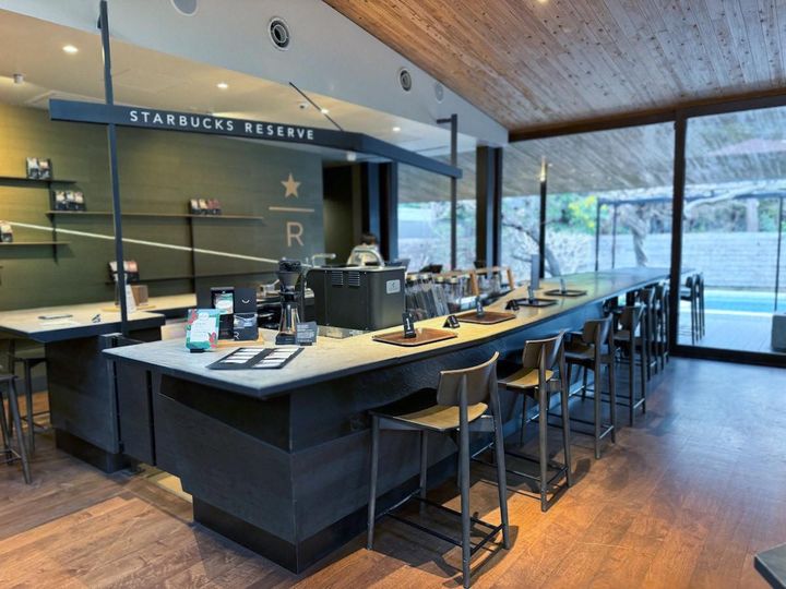 入口のすぐにある2席のソファ席は、「スターバックス リザーブ®」のシンボルである星のロゴマークに合わせて五角形になっていて、窓ガラスからは鎌倉の景色を眺められます。ぜひソファ席のデザインにもぜひ注目してみてください。