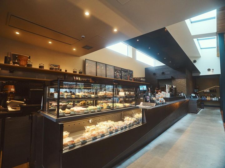 左手側にはコーヒーやフードを注文するレジカウンターがあり、ショーケースには季節や定番フードが揃います。開店直後は特に品揃えが豊富。朝は7時にオープンするので、コーヒーと一緒にモーニングを楽しむこともできますよ。