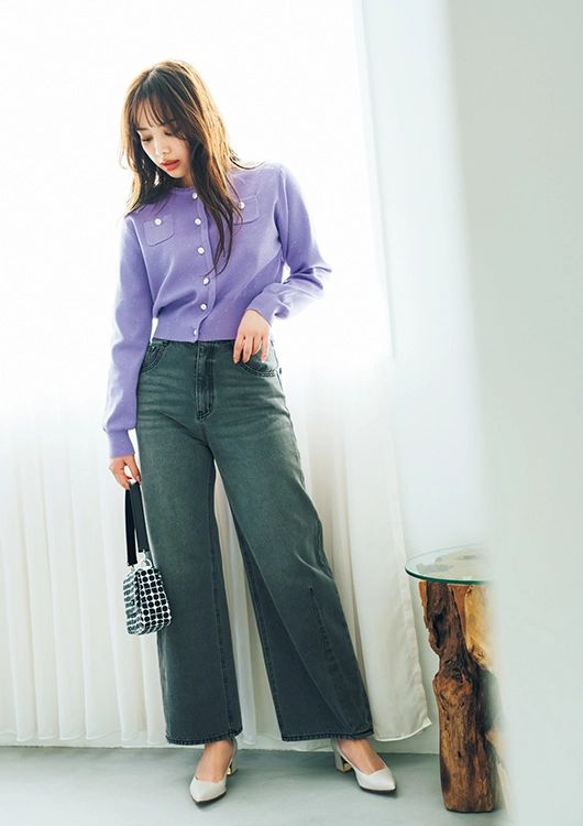 黒バレルラインデニムパンツ¥9,460/NATURAL BEAUTY BASIC ラメニットカーディガン¥18,7000/カデュネ バッグ¥45,100/ケイト・スペードニューヨーク(ケイト・スペード) パンプス¥17,600/ダイアナ(ダイアナ 銀座本店)