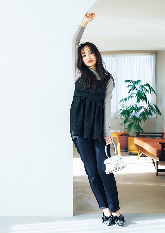 ウエストデザインデニムパンツ¥14,300/ココ ディール チュールトップス¥11,440/SNIDEL ルミネ新宿2店 イヤリング¥3,850/ハクフルール(ロードス) リング¥47,300/アナプノエ(フォーティーン ショールーム) バッグ¥69,300/ルナイン/ルル・ウィルビー(アルアバイル) ミュール¥14,900/CHARLES&KEITH JAPAN