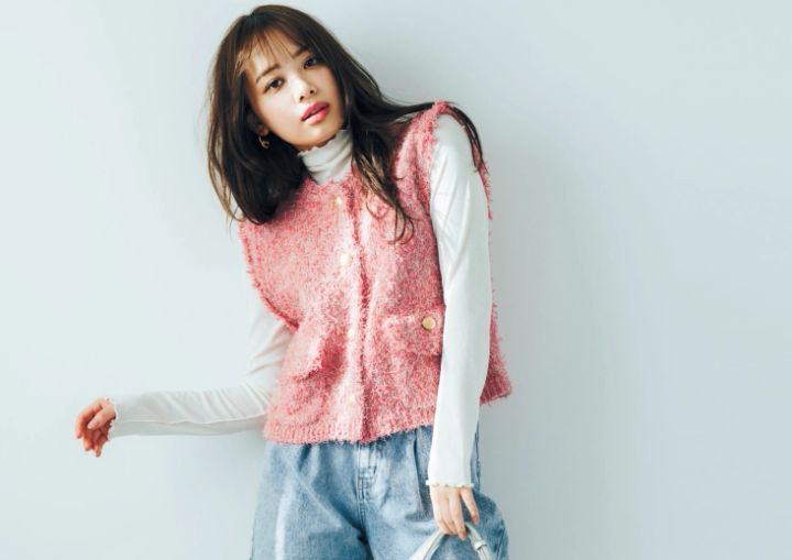 ワイドデニムパンツ、ニットベスト各¥19,800/アルページュストーリー カットソー¥990/GU イヤリング¥7,700/ハッピーケイクジュエルズ(ロードス) バッグ¥13,200/ル・ベルニ(キャセリーニ) パンプス¥18,150/ダイアナ(ダイアナ 銀座本店)