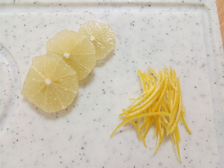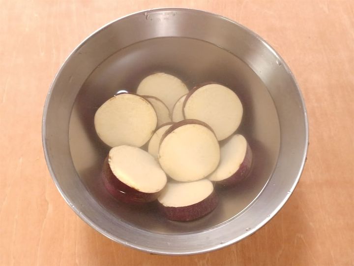 1.さつまいもは皮つきで1cmの輪切りにし、水に10分さらす。レモンは皮と身に分け、身は薄切り、皮は白いところを除いて千切りにする。