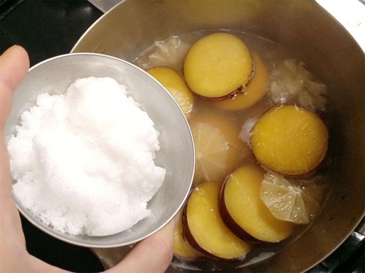 さつま芋が柔らかくなったら砂糖をイン!
