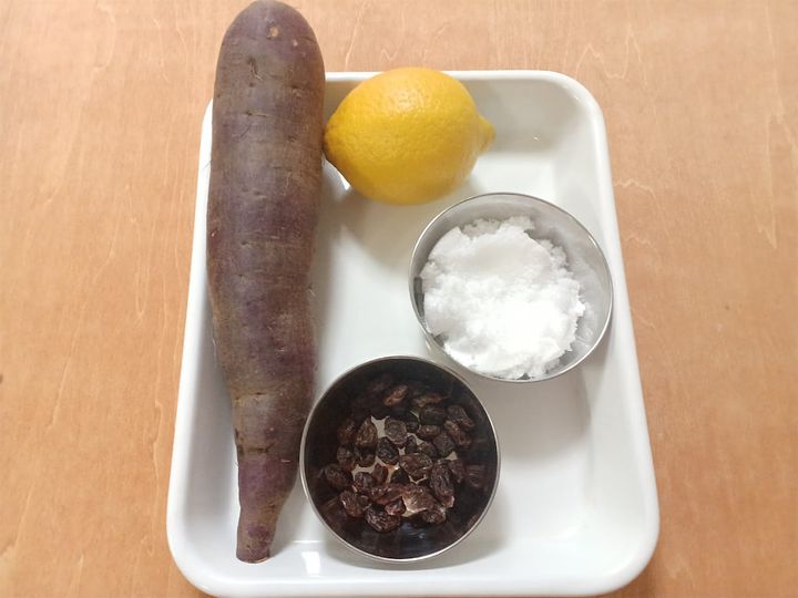 昨今、焼くだけで甘いさつまいもが出回っているので、「さつまいもといえば焼き芋」というイメージが定着しましたね。でも、昔ながらのこういうレシピもおいしいよ、と福島県の農家に「さつまいものレモン煮」を教わりました。このレシピでは、レモンの実も皮もすべて使うほか、レーズン入りということで、味も見た目もちょっぴりゴージャス★わたしもさつまいもが大好きなので、ルンルンで作っていきたいと思いま~す♪