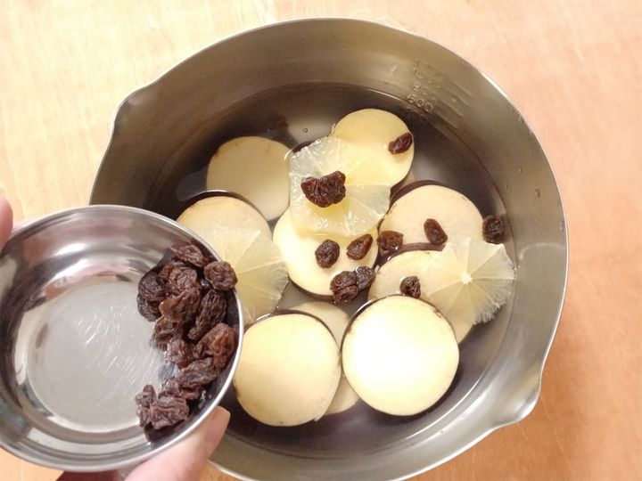 2鍋に1のさつまいもとレモンの果肉、レーズンを入れて、浸るくらいの水(分量外)を入れたら火にかける。沸騰したら火を弱め、さつまいもが柔らかくなったら砂糖を加えて煮詰める。