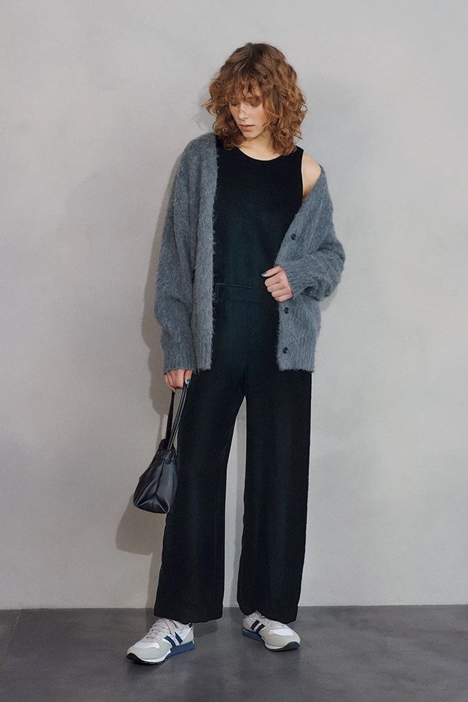 気負わず着られるストレートなニットオールインワンを、すがすがしいほど潔いVネックでセンシュアルに味つけ。ふわっと毛羽立つフォックス混のニットは、見た目まで心地いい。