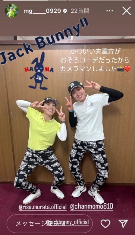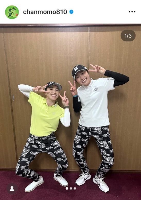 そんなアツい黄金世代の大里桃子プロ、先日SNSにアップしていたのが、村田理沙プロとのおちゃめなショット。おしゃれなリンクコーデなのに、ふざけたポーズをとっているのがまた笑ってしまいます。