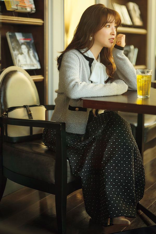 ノーカラージャケット風だから、ボウタイブラウスをインするクラシカルな着こなしでフォーマル感も完璧です。小粒のドット刺しゅうが上品可愛い黒スカートはほどよく厚みのあるジャカード地なので、 春先のやや肌寒い日にも頼れる!