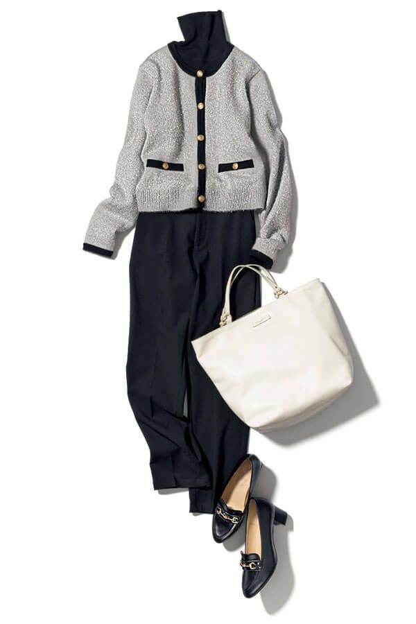 ラメと金ボタンできらめきを備えたカーデが、黒メインのパンツルックを女性らしく華やかに彩る主役。着こなしに軽やかさも欲しい春だから、ビッグサイズの白バッグで抜け感フォローも万全に。