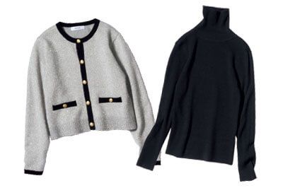 ジャケット風デザインできちんと見えするカーデはラメ混ニットで今っぽい華やかさも万全。インは着回しやすいシンプルな黒タートルがセットになっているので、シックなモノトーンコーデも簡単です。
