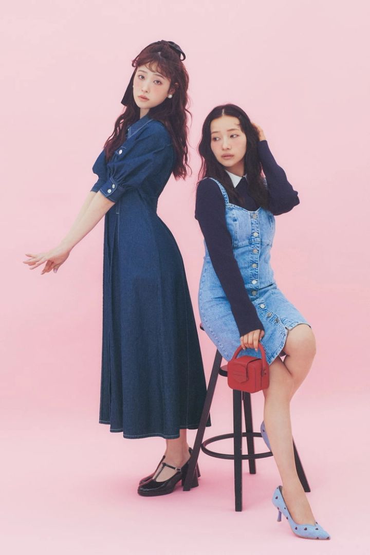 〈さえ〉デニムミニワンピース 8,990円/Gap ネイビーロゴポロニット 8,690円/LILLIAN CARAT(リリアンカラット) バッグ 10,900円/チャールズ&キース(チャールズ&キース ジャパン) パンプス 17,050円/ダイアナ(ダイアナ 銀座本店)〈ひかる〉デニムロングワンピース 13,200円/dazzlin イヤリング 7,560円/アビステ パンプス 10,500円/チャールズ&キース(チャールズ&キース ジャパン) リボン/スタイリスト私物