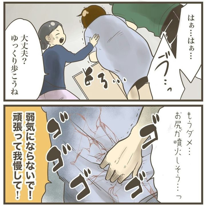 この漫画は4000gを超える巨大児を出産したミロチさんの体験をつづったものです。痛みに耐えながら、分娩台へゆっくり移動するミロチ(@mirochi8989)さん。「おしりが噴火しそう」と弱音を漏らすも、助産師さんから我慢するよう励まされます。もう無理だと思ったミロチさんの体に起こったこととは?『2人目は巨大児でした』第45話をごらんください。
