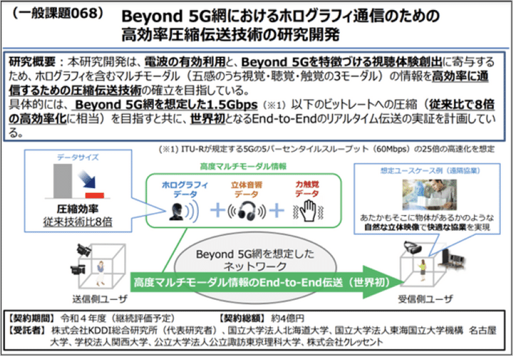 このプロジェクトは、国立研究開発法人情報通信研究機構(NICT(エヌアイシーティー))の委託研究として約4億円の支援を受け、株式会社KDDI総合研究所などと共同で取り組んでいます。背景には、現状の5Gからさらに高速・安定・大容量の通信が可能になった 「Beyond 5G」の社会の成立を想定しています。