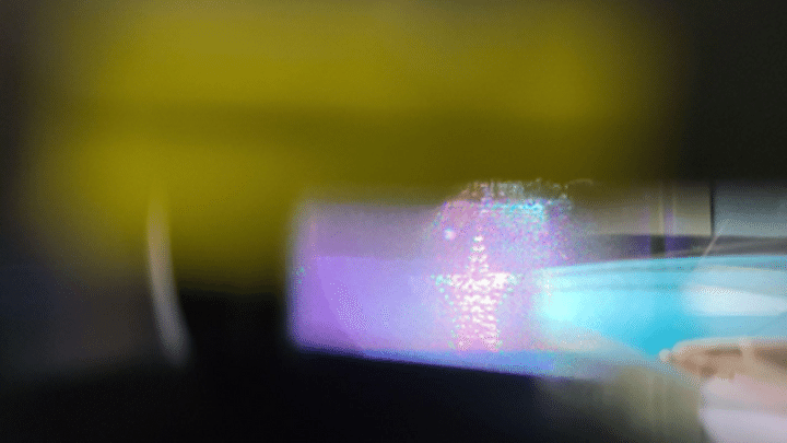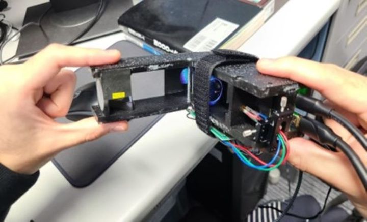 榊原さんが開発中のヘッドマウントディスプレイ型の、電子ホログラフィの試作機。星が回転していて、まるで街中で見るイルミネーションのようでした!