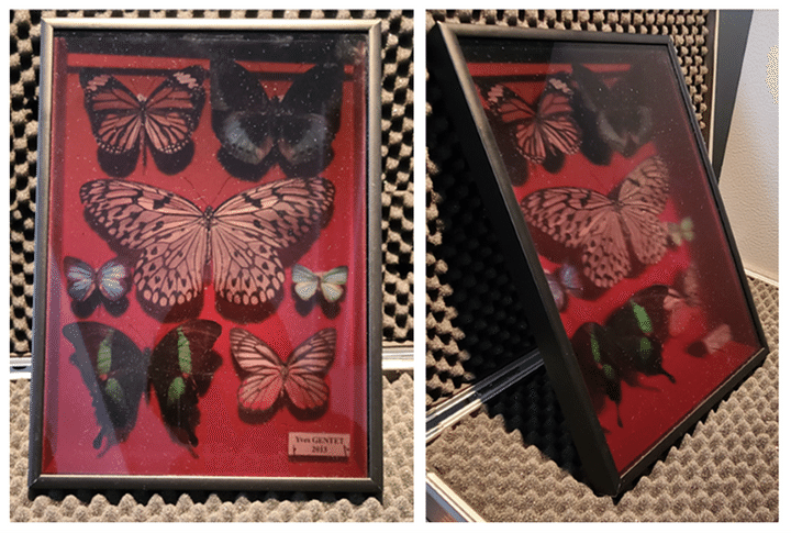 実はこれ、3Dに見える一枚の画像なんです。標本をレーザー光で撮影し、ガラス板に記録されたもので、蝶の実物はここにはいません。