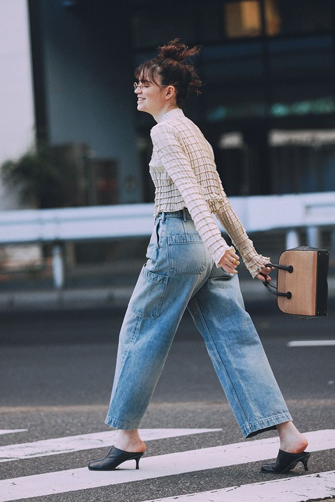 レトロなデザイン性やガーリーな柄などのかわいいトップスもくすんだ色みで選べば、ヴィンテージ感をフックにデニムとなじみよく着られる。ミュールで素足を見せ、幅広フォルムでもすっきり軽快に。デニムの後ろ高めに配置されたバッグポケットとステッチで、ヒップアップ効果もねらえる。